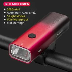 ROCKBROS Bicycle Light 600 Lumen 2600mAh Bike Headlight 5 Lightning Modes 200m Long Shot – Black and Red Gradient